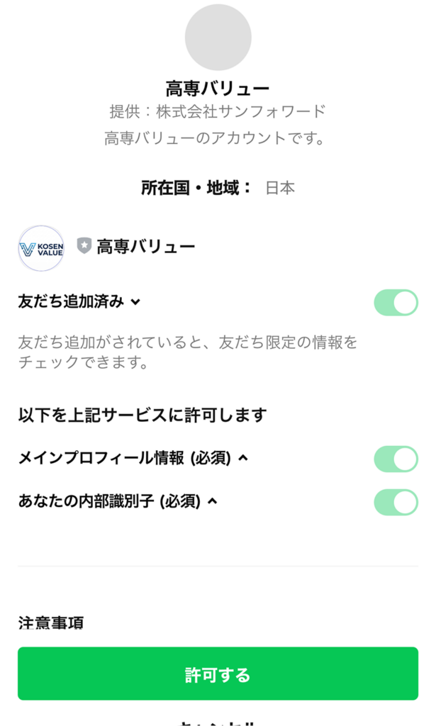 LINEが開いたら友だち追加をONにし「許可する」をタップ。